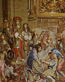 C'est ainsi qu'incluse dans la Manufacture des Meubles de la Couronne, la Manufacture des Gobelins reçoit de l'édit royal de novembre 1667 son organisation définitive, d'importants avantages étant octroyés à ses habitants : exemption d'impôts, renoncement au droit d'aubaine, entretien des apprentis choisis. Charles Le Brun y déploie jusqu'à sa mort le 12 février 1690 une prodigieuse activité, en implantant les premiers travaux de haute lisse - 19 tentures (197 pièces) et 34 en basse lisse (286 pièces) - les œuvres de la Manufacture, conçues pour l'ameublement des Maisons royales ainsi qu'aux présents diplomatiques, acquièrent par leur magnificence une réputation internationale qui subsiste trois siècles plus tard. Différents successeurs tels Pierre Mignard et Robert de Cotte continuent et développent le dessein de Le Brun.