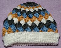 Mais on peut en particulier commencer de nouvelles colonnes à partir d'un bord quelconque d'un tricot ; ceci se nomme relever des mailles, et c'est la base de l'entrelacement. L'entrelacement forme un riche motif en échiquier (Cf. Fig. 20), en tricotant de petits carrés, en relevant leurs côtés et en tricotant d'autres carrés pour continuer perpendiculairement le vêtement.