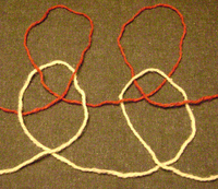 La topologie d'une étoffe tricotée est par conséquent assez complexe. Contrairement au cas des étoffes tissées, où les fils courent d'habitude tout droit horizontalement et verticalement, le fil qui a été tricoté suit un chemin plein de boucles le long de son rang, comme le fil rouge du diagramme de gauche, où les mailles d'un rang ont toutes été tirées à travers celles du rang inférieur.