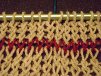 - soit toujours on tricote aussi le fil caché, ce qui donne une épaisseur supplémentaire, pour une grande chaleur et un beau drapé. De plus les décors apparaissent à l'envers dans la couleur qui y est tricotée. Dans le cas où il y a plusieurs couleurs, les fils supplémentaires sont passés entre la maille tricotée sur le devant et la maille tricotée sur l'envers.