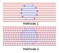 Il existe deux approches les plus courantes, appropriées à des dessins de style différent. La Fig. 21 représente schématiquement ces deux méthodes. Elle ne présente que le trajet moyen des fils de couleur, en négligeant les sinuosités des mailles. Il s'agit d'illustrer un rond bleu sur fond rouge.